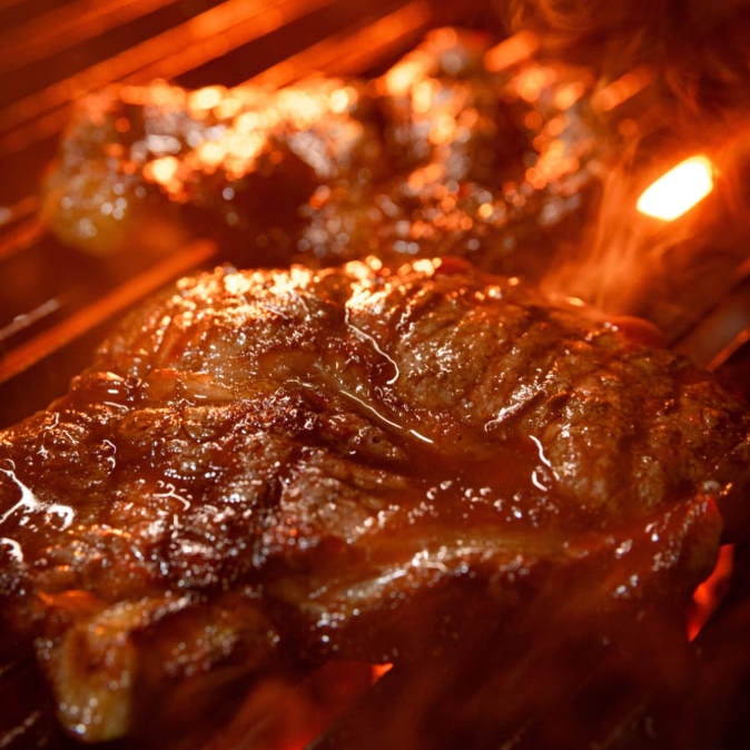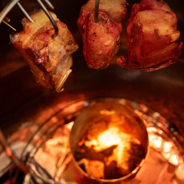 Carne de res al carbón con queso mozzarella, bondiola de cerdo desmechada al barril en BBQ especial, tocineta ahumada y vegetales frescos.