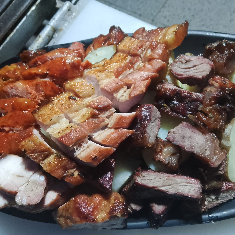 Mix parrillero para dos personas con panceta, res, chorizo, papa, yuca y salsas de la casa.