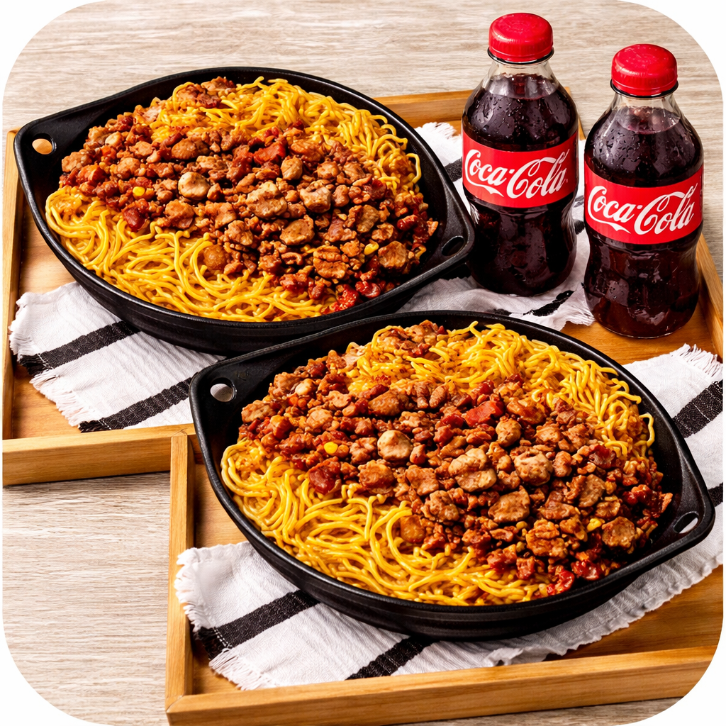 Pasta, pollo, costilla, chicharrón, plátano maduro y maicitos, 700 g de pasta, 300 g de proteínas y 2 Coca-Cola 250ml.