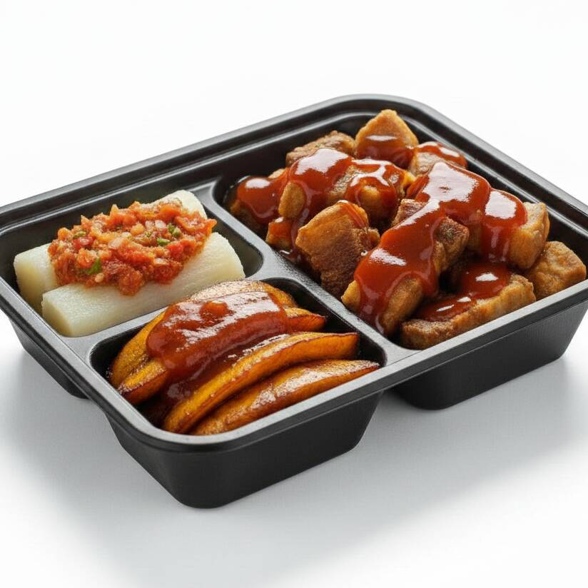 Crocante chicharrón carnudo bañado en salsa bbq, acompañado de yuca al vapor o papa francesa y madurito con bocadillo.