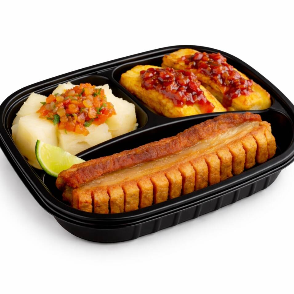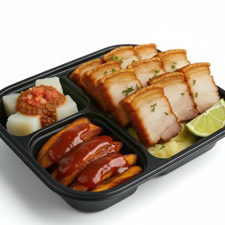 350 Gr de crocante, carnudo y delicioso chicharrón dentado, acompañado de yuca al vapor y maduro horneado con bocadillo.