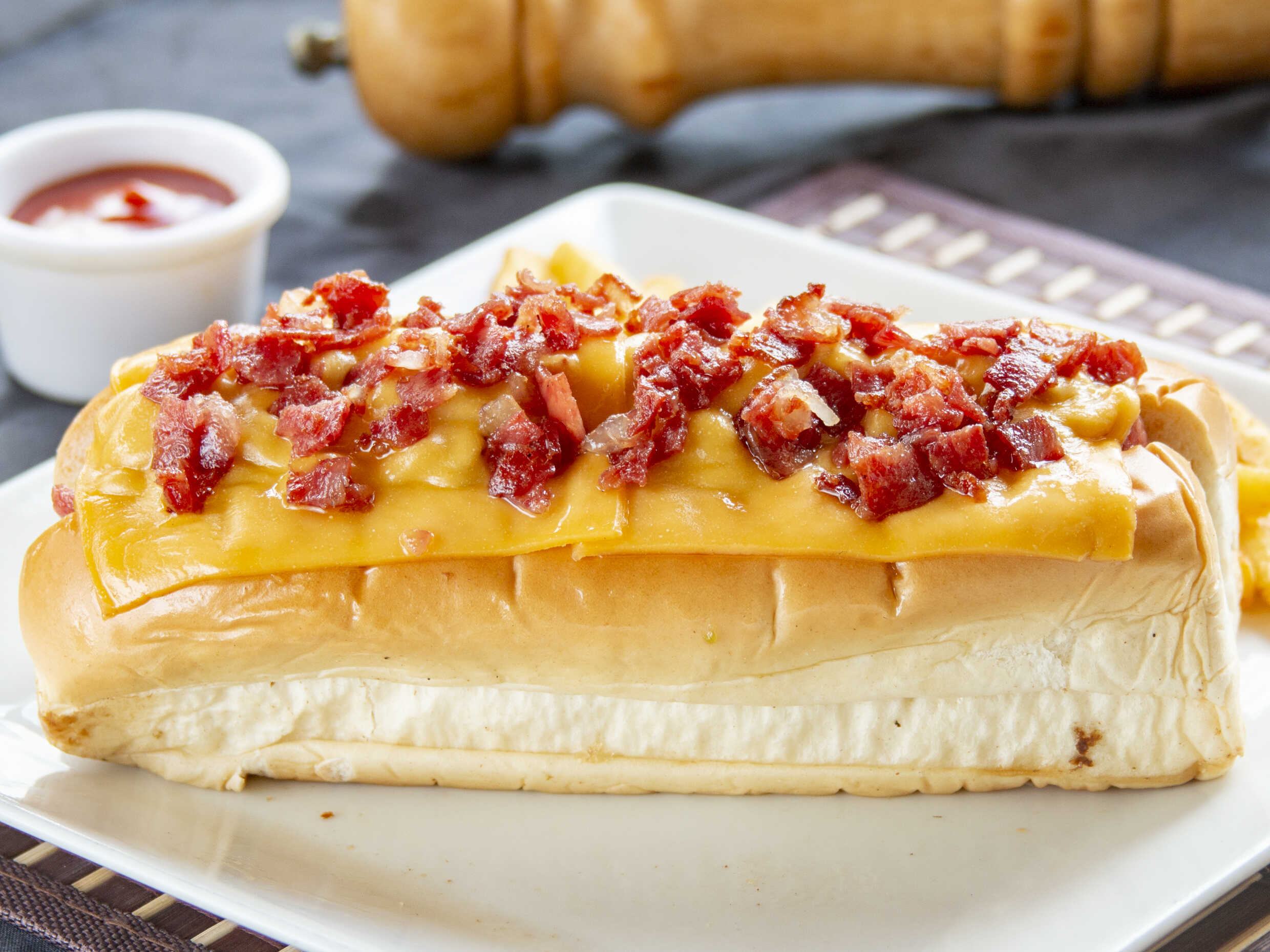 Salchicha americana, tocineta picada, papa fosforito, cebolla y salsa cheddar. ( con papas)