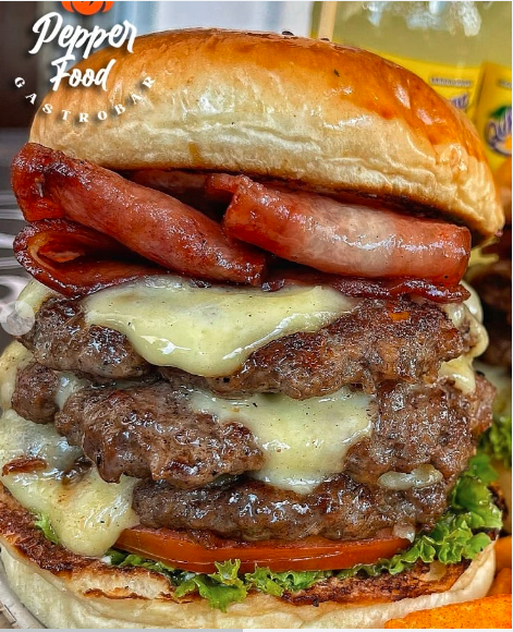 Hamburguesa Pepper Beef contiene pan brioche artesanal ,Doble carne de res 240gr, tocineta ahumada, queso doble crema , doble aros de cebolla, vegetales frescos( lechuga tomate cebolla ) y salsas de la casa ( con papitas a la francesa 80 gramos )