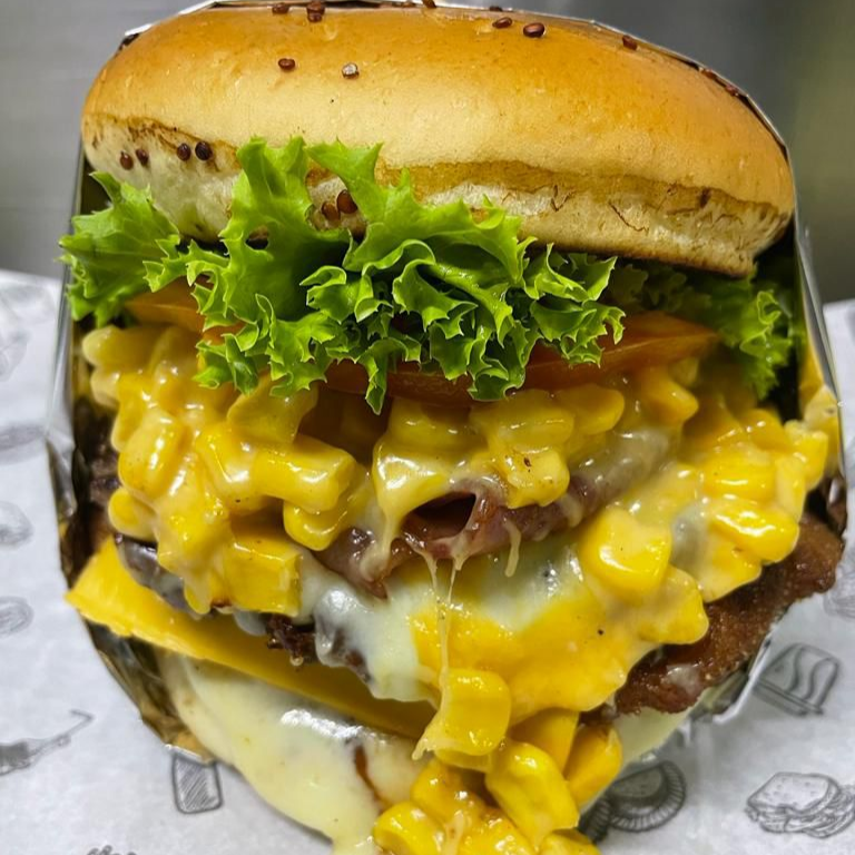 Doble carne de res artesanal (120 g c/u), doble tocineta ahumada, doble queso (doble crema y cheddar), doble aros de cebolla, cogollo europeo, cebolla, tomate y salsa especiales (Tártara y piña).