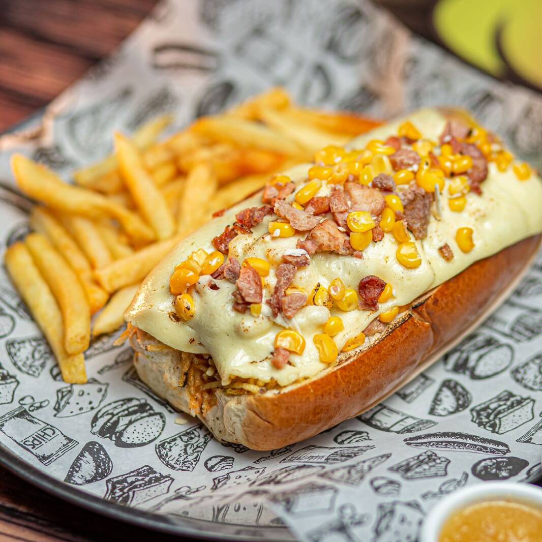 Papas a la francesa, chorizo premium , carne desmechada, maiz tierne, tocineta ahumada, queso rallado y salsa especial. (Para una persona)