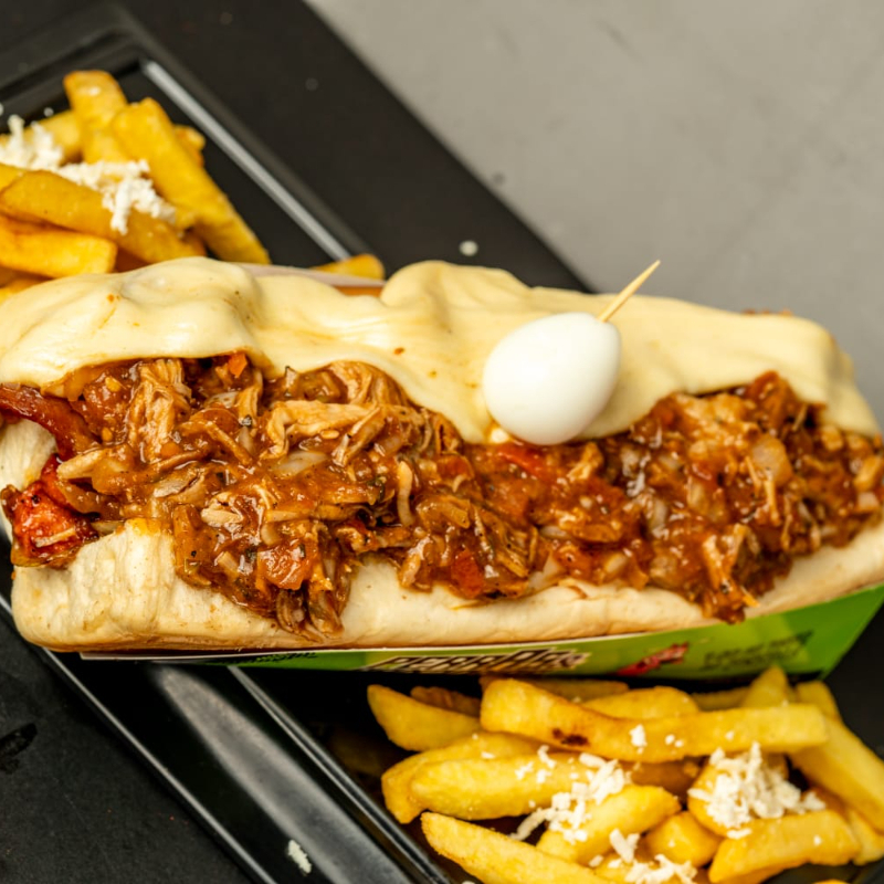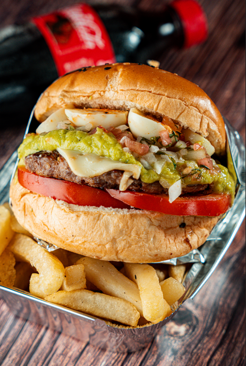 120 g De carne de hamburguesa, queso mozzarella, carne de cerdo en BBQ, maicitos, tomate, pan sellado en mantequilla y papas francesas.