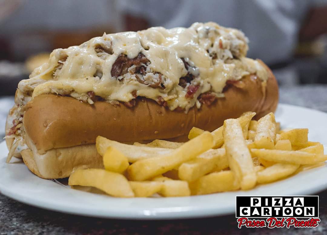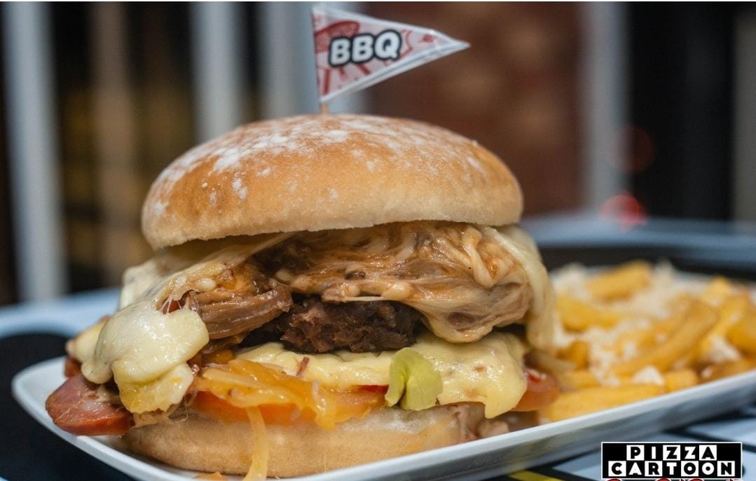 Carne desmechada bañada en salsa BBQ, tocineta, chorizo, cebolla grille, tomate, queso y lechuga.