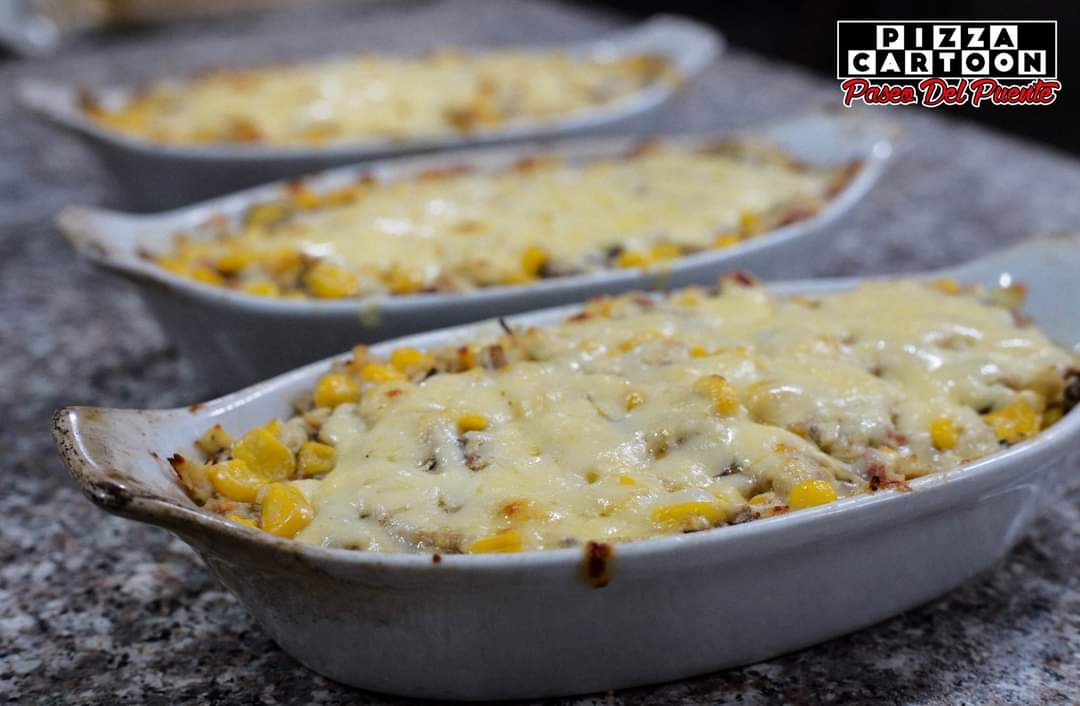 Maíz desgranado, pollo, champiñones, tocineta y salsa bechamel.