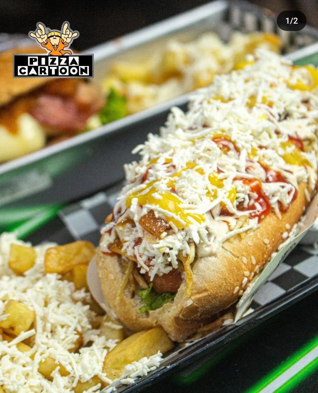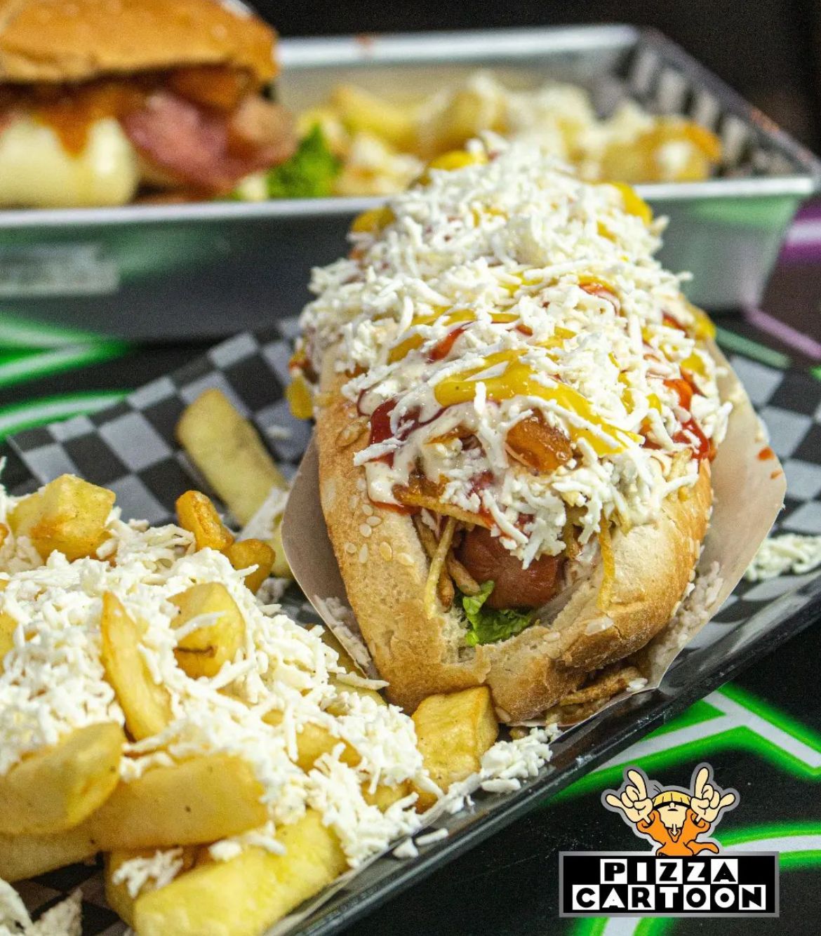 Salchicha americana, carne desmechada, jalapeños, cebolla, tostacos y queso gratinado.