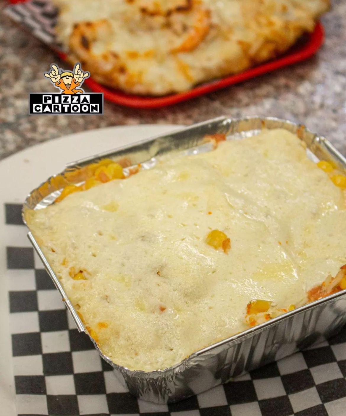 Maíz desgranado, pollo, champiñones, tocineta y salsa bechamel + 1 porcion de pizza tradicional