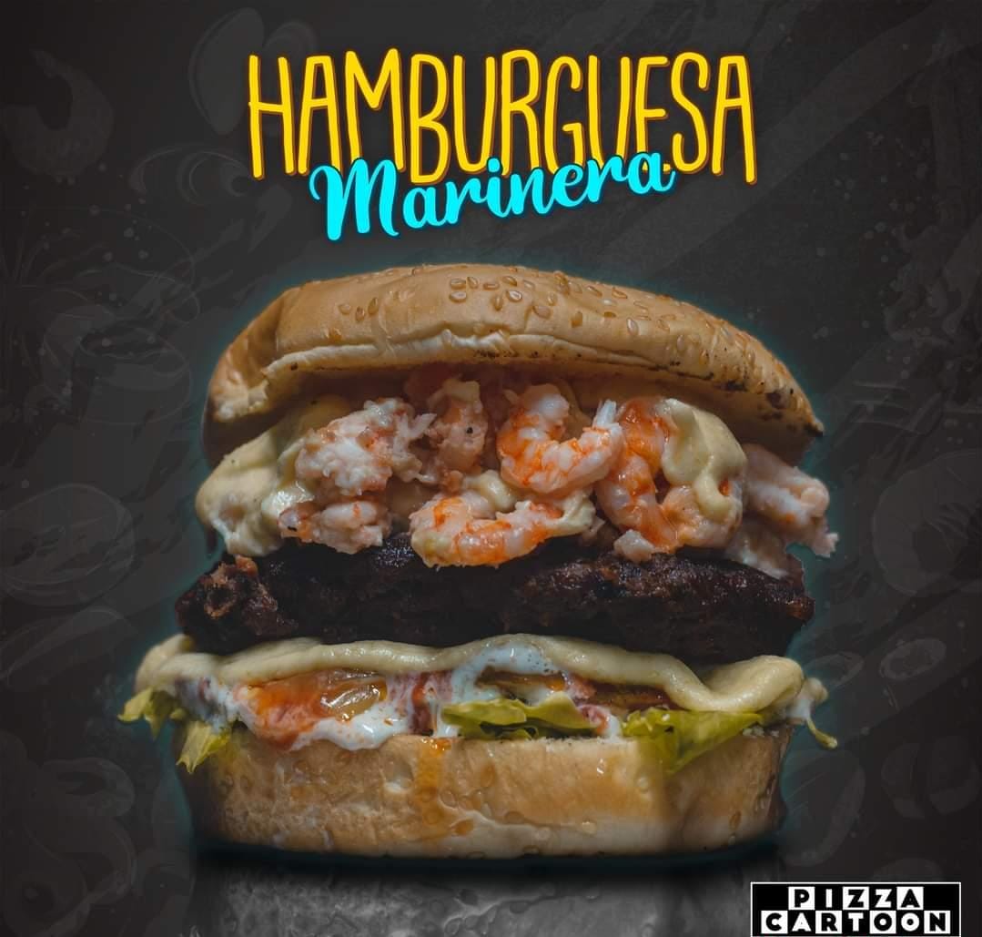 Carne, tocineta, camarones, cebolla grille, tomate, lechuga y queso mozzarella.