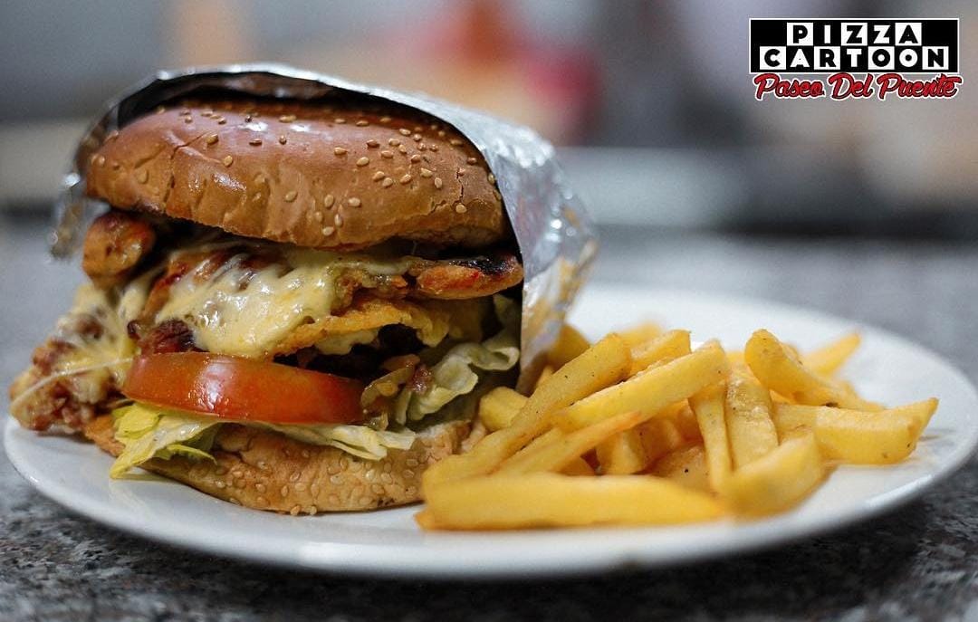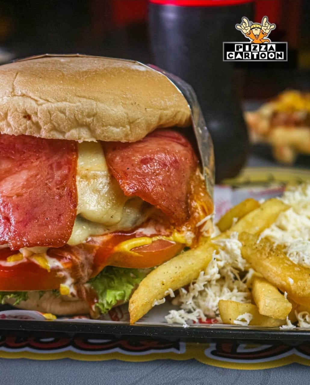 Carne, tocineta, cebolla grille, tomate, lechuga, queso mozzarella, maduro y huevo frito.