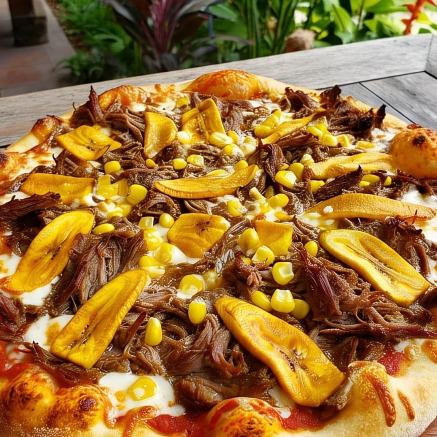 MASA MADRE,SALSA NAPOLITANA, QUESO MOZARELLA, CARNE ESMECHADA, MADURO FRITO, MAIZ