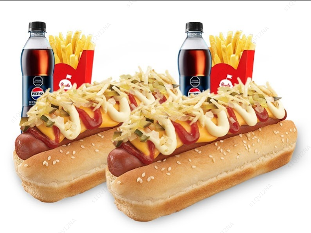 2 perros con salchicha americana, queso cheddar, pepinillos, cebolla, papa fosforito y salsas Presto + 2 papas pequeñas + 2 bebidas.