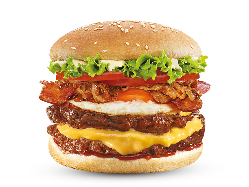 Doble carne artesanal de 208gr (104gr c/carne), salsa de tomate, doble tajada cheddar, cebolla grillé, tomate, huevo frito y tocineta.