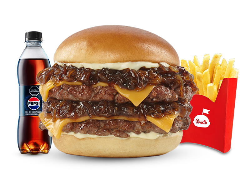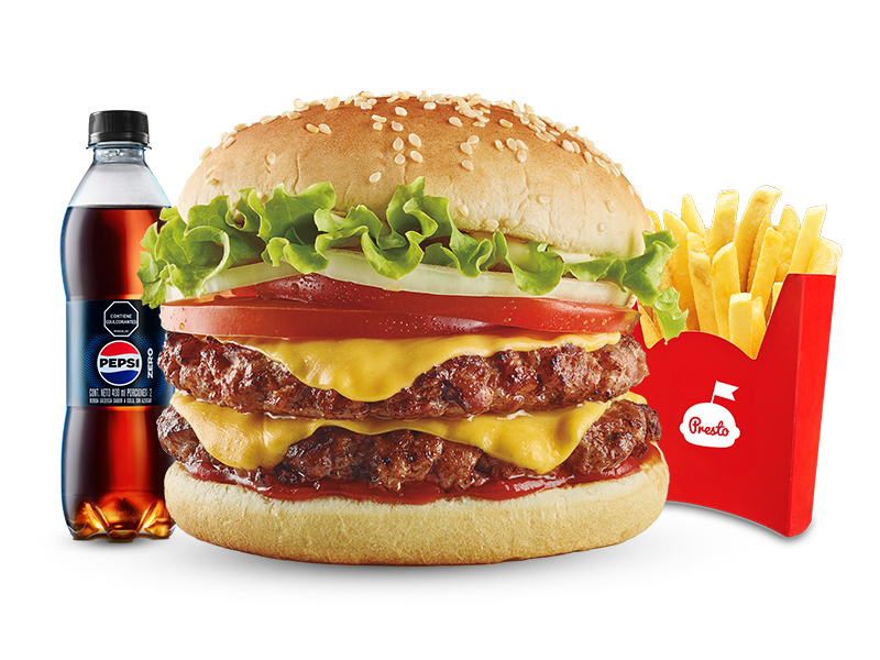 Hamburguesa doble carne de 208gr (104gr c/carne) con doble queso, cebolla, tomate, lechuga, salsa presto y de tomate, 1 papas medianas, 1 gaseosa 400.