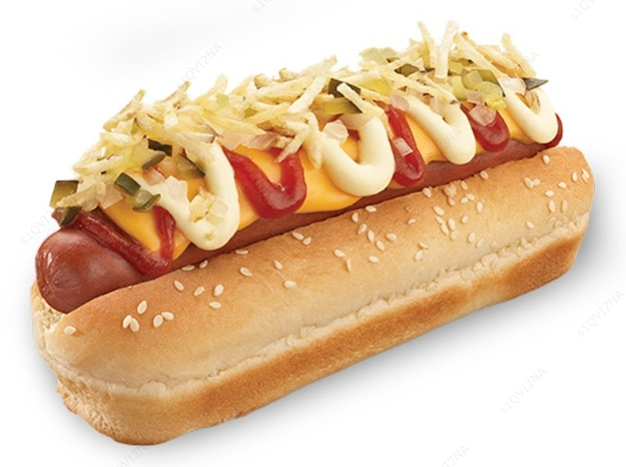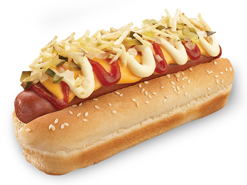 Salchicha americana, tajada de queso tipo cheddar, trocitos de pepinillos y cebolla con papa fosforito y salsas Presto y de tomate.