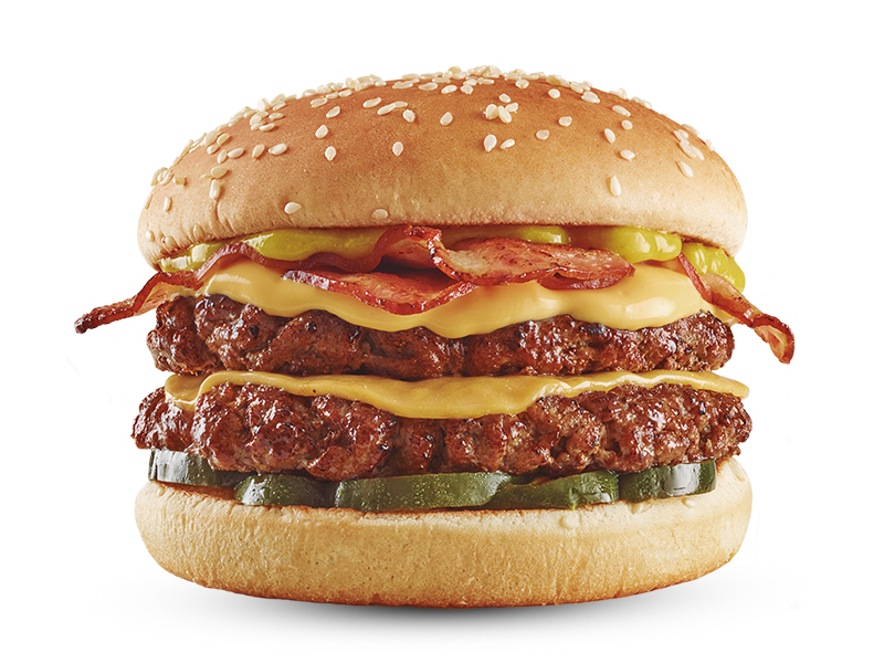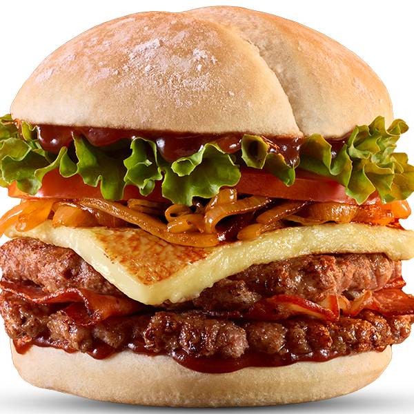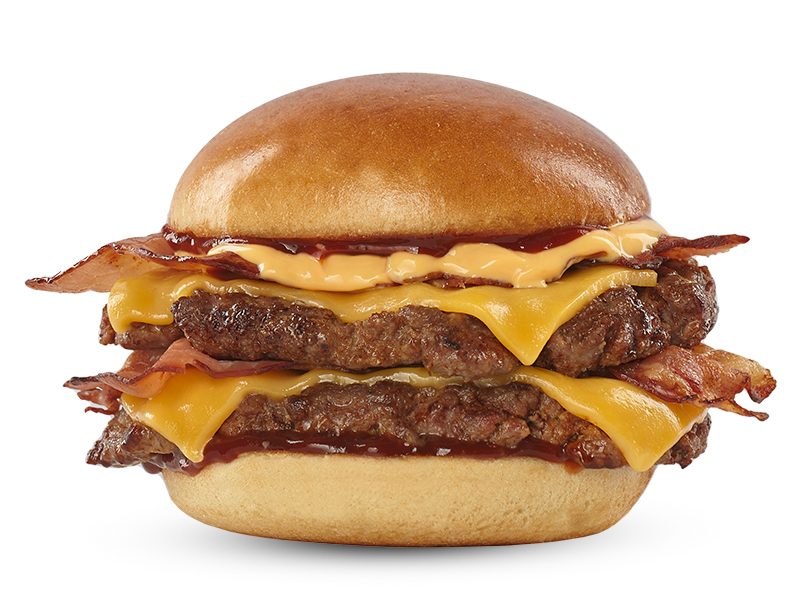 Doble carne artesanal de 104 g cada una con queso para asar derretido al punto perfecto, tres tiras de tocineta crujiente, cebolla grillé, tomate fresco y lechuga crocante, todo envuelto en nuestro pan artesanal y coronado con una deliciosa salsa BBQ dulce dulce.