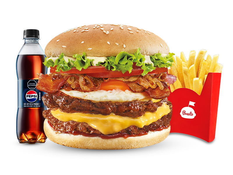 Hamburguesa doble carne artesanal de 208 gr (104 gr cada carne), salsa de tomate, doble tajada cheddar, cebolla grillé, tomate, huevo frito y tocineta, papas mediana, 1 copa de salsa presto y bebida 400ml.