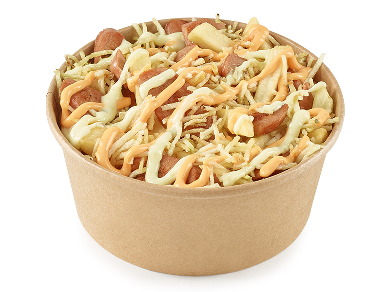 Papas a la francesa, salchicha en julianas, papitas fosforito y salsa de queso cheddar y salsa presto.