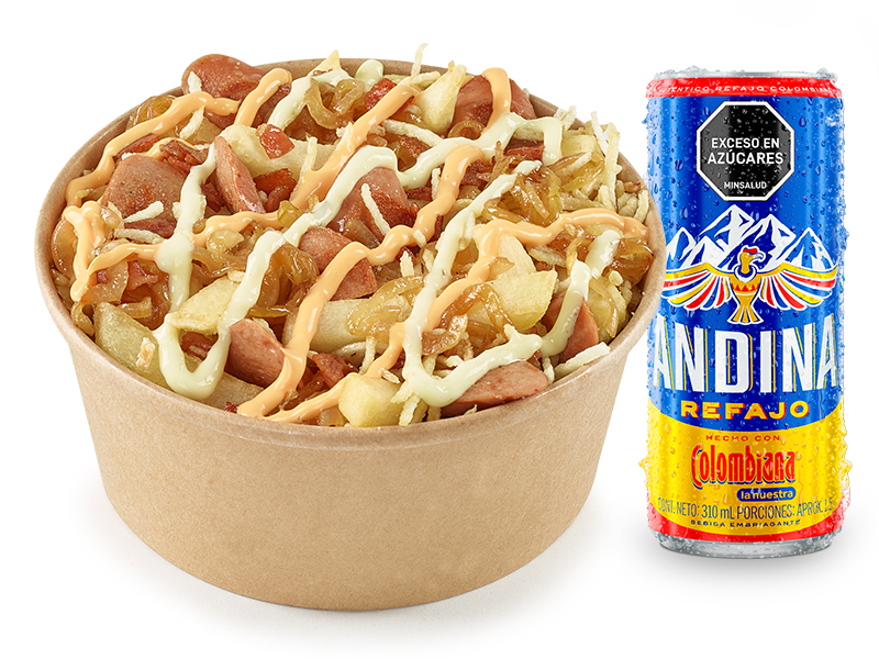 Salchipapa Suprema y gaseosa pet de 400 ml.