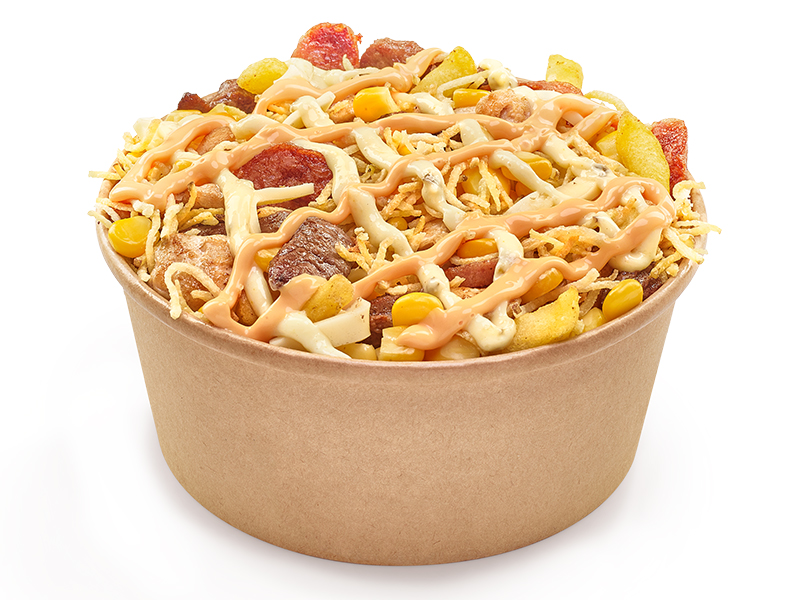 Mazorcada con trozos de pechuga de pollo, lomo, salchicha, maíz desgranado, queso mozzarella, papa francesa y papa fósforo, aderezo cheddar y salsa Presto.
