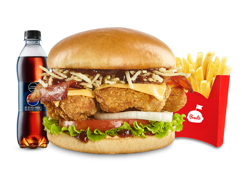 Hamburguesa de pollo crispy, acompañado con papa medianas y bebida pet 400 ml.