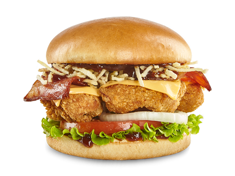 Hamburguesa de pollo crispy, en pan tipo brioche, con tajada de queso cheddar, tocineta, papas fosforito, salsa bbq, lechuga, cebolla y tomate.