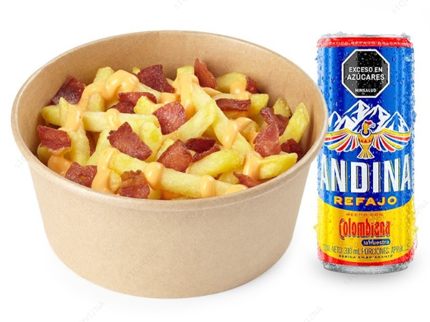 Papas a la francesa (200g) bañadas en aderezo tipo cheddar, acompañadas de 2 tiras de tocineta crocante y una bebida 400 ml.