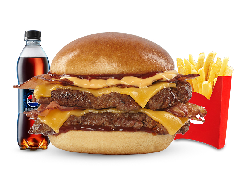 Doble carne artesanal de 104 g cada una con queso para asar derretido al punto perfecto, tres tiras de tocineta crujiente, cebolla grillé, tomate fresco y lechuga crocante, todo envuelto en nuestro pan artesanal y coronado con una deliciosa salsa BBQ dulce. incluye papas medianas doraditas y una gaseosa pet de 400 ml para completar la experiencia.