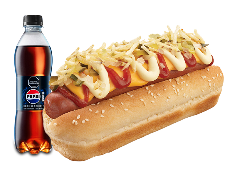 Salchicha, tajada de queso tipo cheddar, salsas presto y de tomate, pepinillos, cebolla y papa perro + 1 Bebida 400 ml
