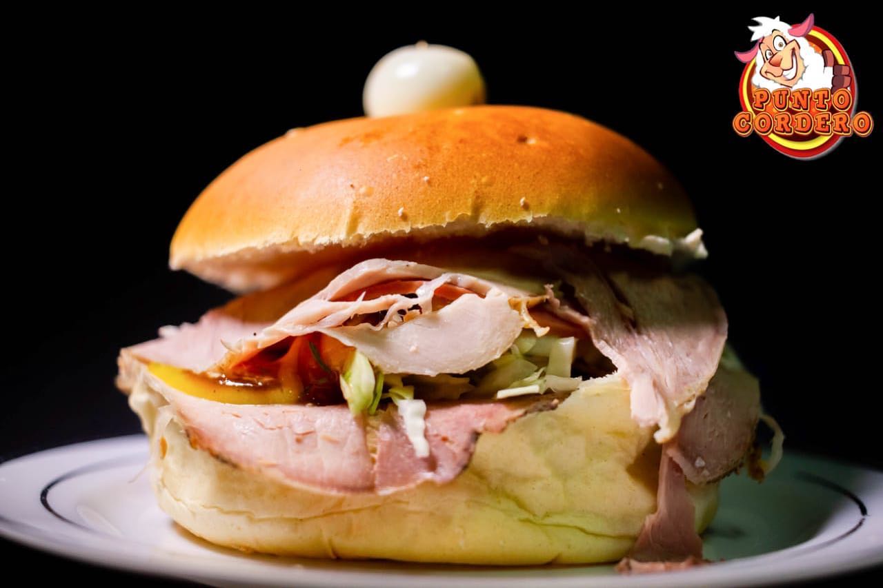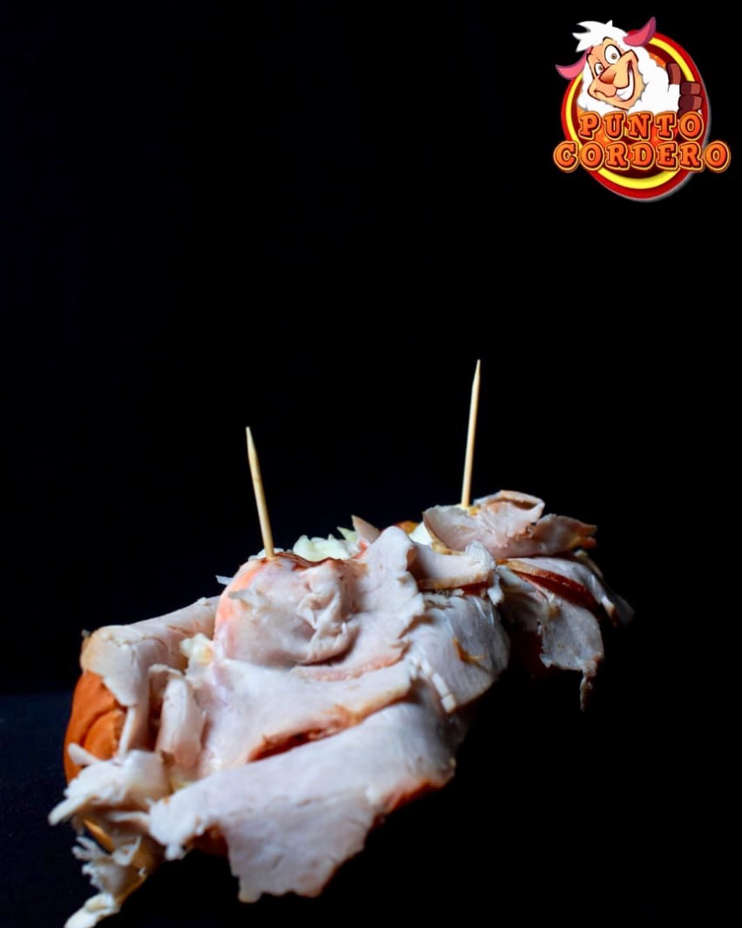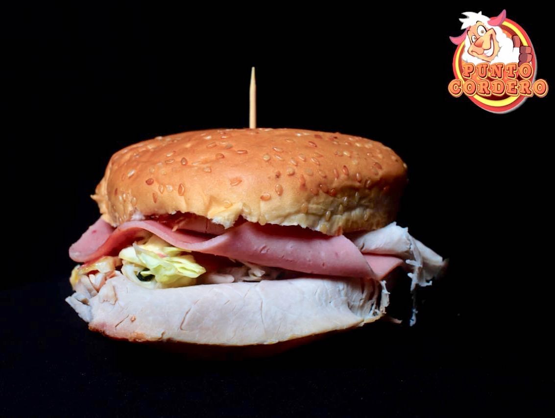 Carne de cordero, tomate, cebolla, salsa ciruela, salsa piña, salsa rosada, salsa tártara, mostaza.