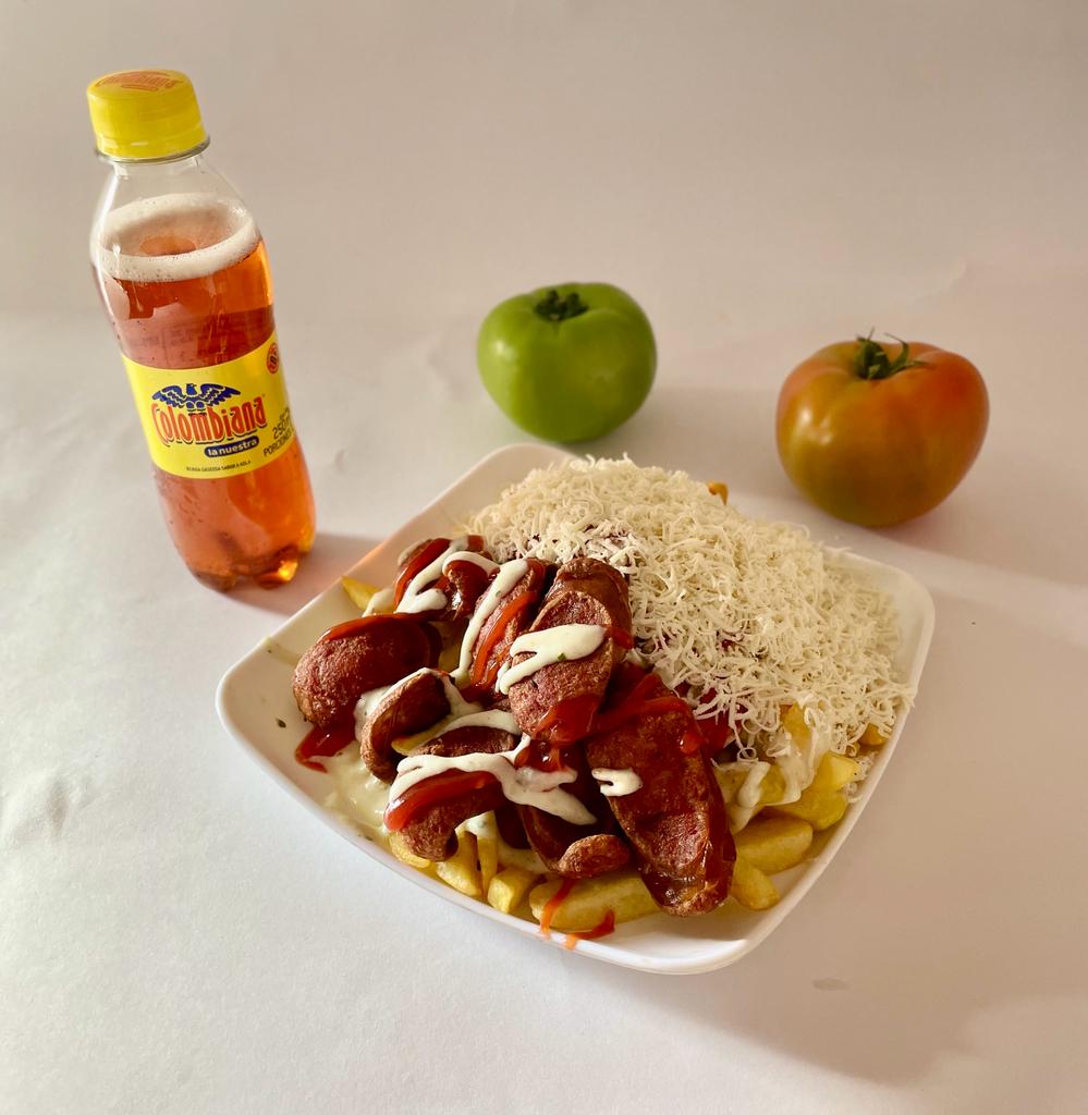 Lomito de res, pollo desmechado, salchicha Ranchera, queso gratinzado, chorizo, papas a la francesa, cebolla grille, salsa ciruela, salsa piña, salsa rosada, tártara, mostaza.