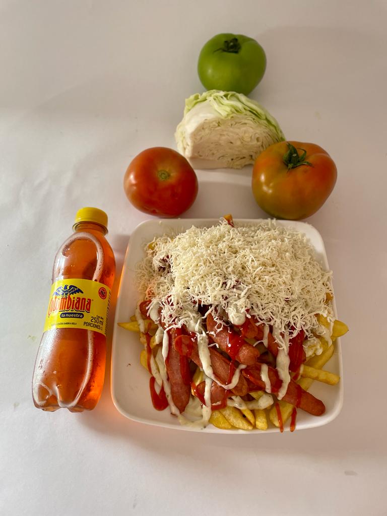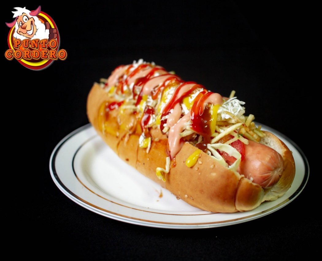 Salchicha tradicional, tomate, cebolla, papa miga, queso rallado, salsa ciruela, salsa tártara, salsa rosada, mostaza y porción de papa francesa.