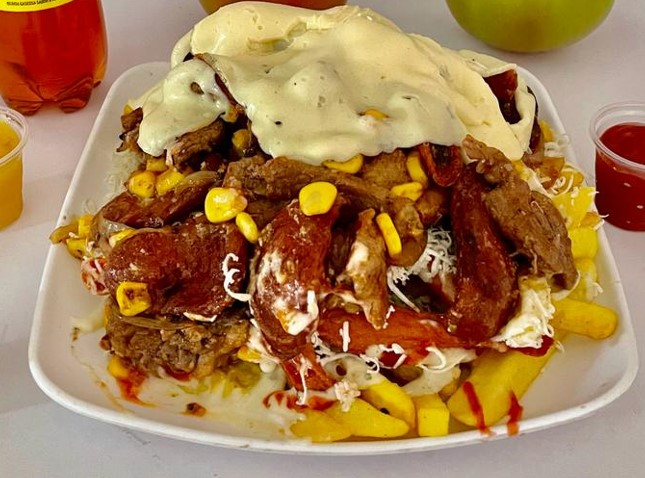 Lomito de res, salchicha Ranchera, chorizo, papas a la francesa, pollo desmechado, queso gratinado, cebolla grille, salsa ciruela, salsa piña, salsa rosada, tártara, mostaza.