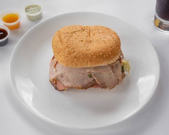 Carne de cordero, tomate, cebolla, salsa ciruela, salsa piña, salsa rosada, tártara, mostaza.