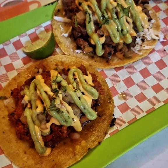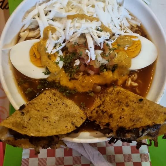 exquisita sopa de birria con fideos, dos tacos de tortilla de maiz uno de lomo de res y otro de bondiola de cerdo, huevo cocido, pico de gallo...