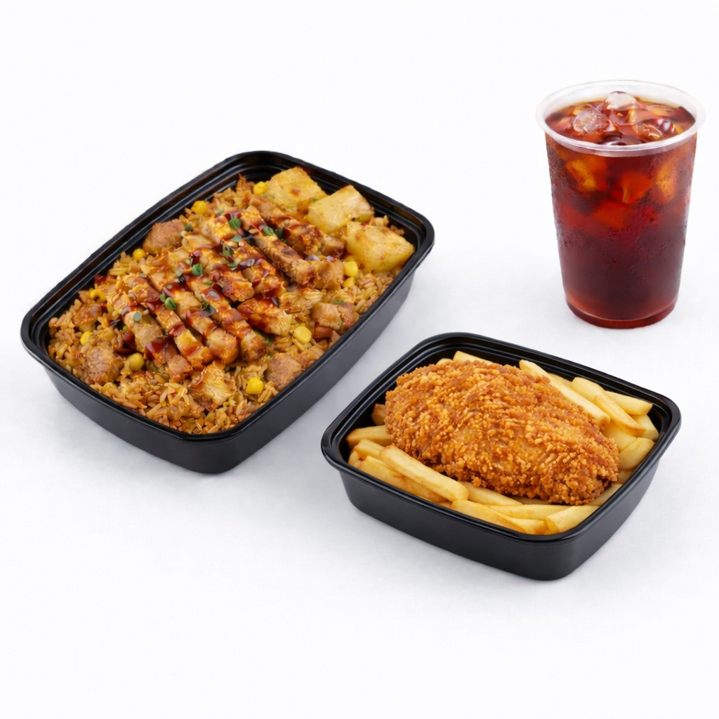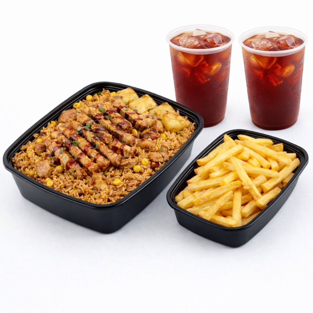 Arroz ranchero bien cargado 1000 gr, pollo, cerdo, maiz, con chicharrón crocante picado y yuca cocida en trozos. Acompañado de papa francesa. Incluye 2 té helados de cortesia.