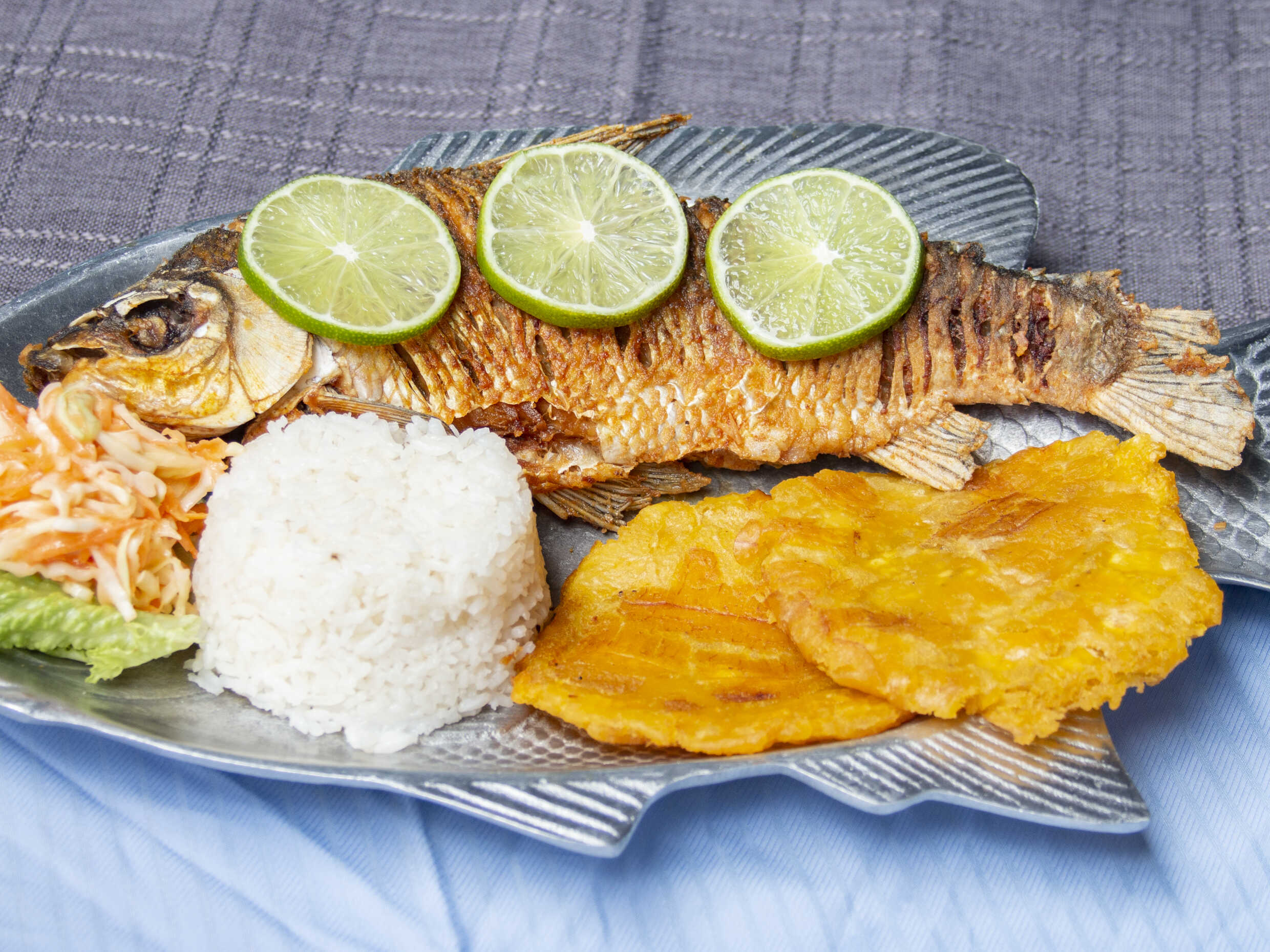 Delicioso bocachico frito acompañado de arroz, patacon, ensalada, sopa del dia y limon
