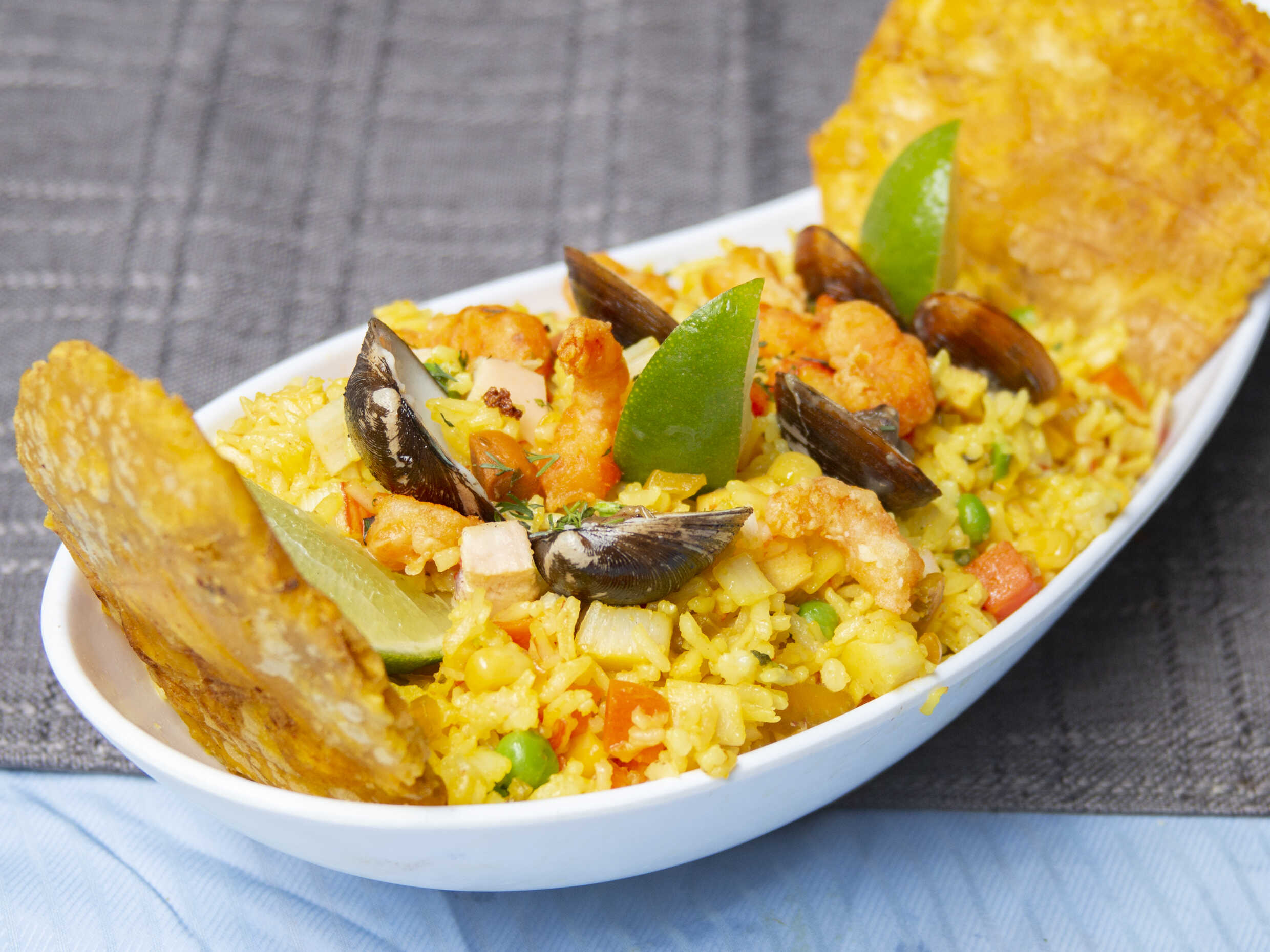 Palmito de cangrejo, pulpo, calamar, camarón, almejas, langostino, carne, lomo de cerdo, pollo, chorizo ahumado y verduras. Acompañada de patacón y sopa del día.