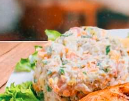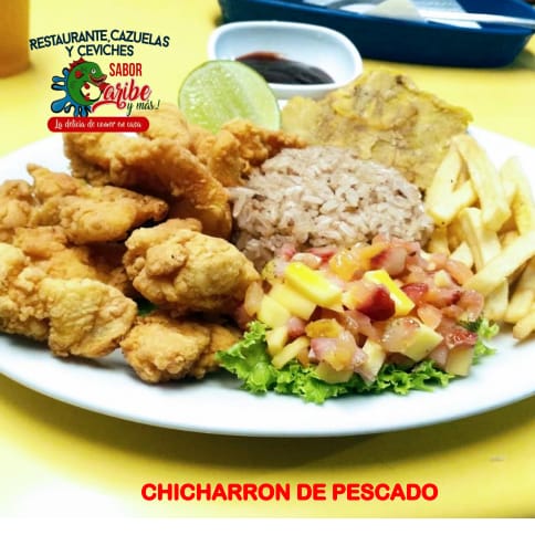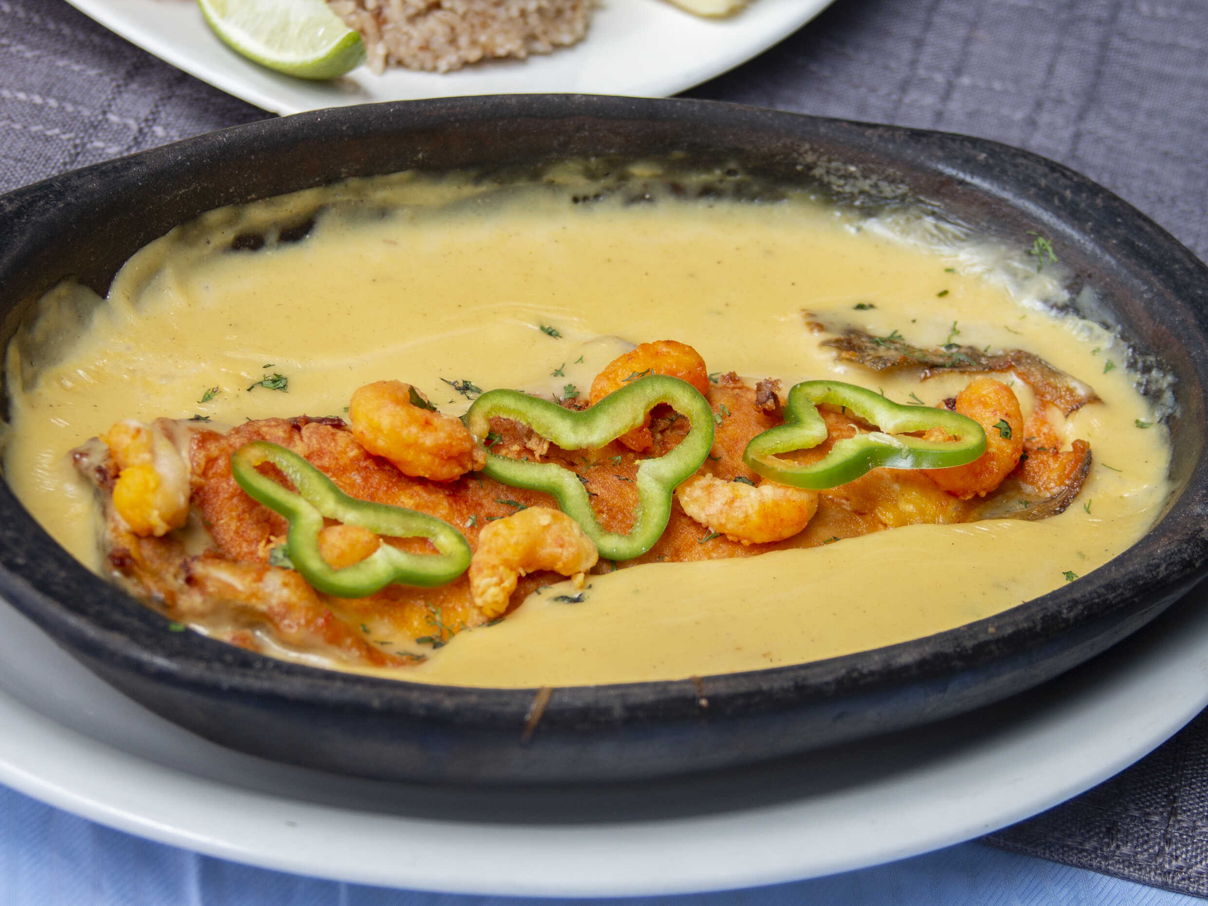 Deliciosa Trucha en salsa de camaron con crema de cazuela y camarones apanados por encima. Acompañado de arroz,patacon, ensalada.