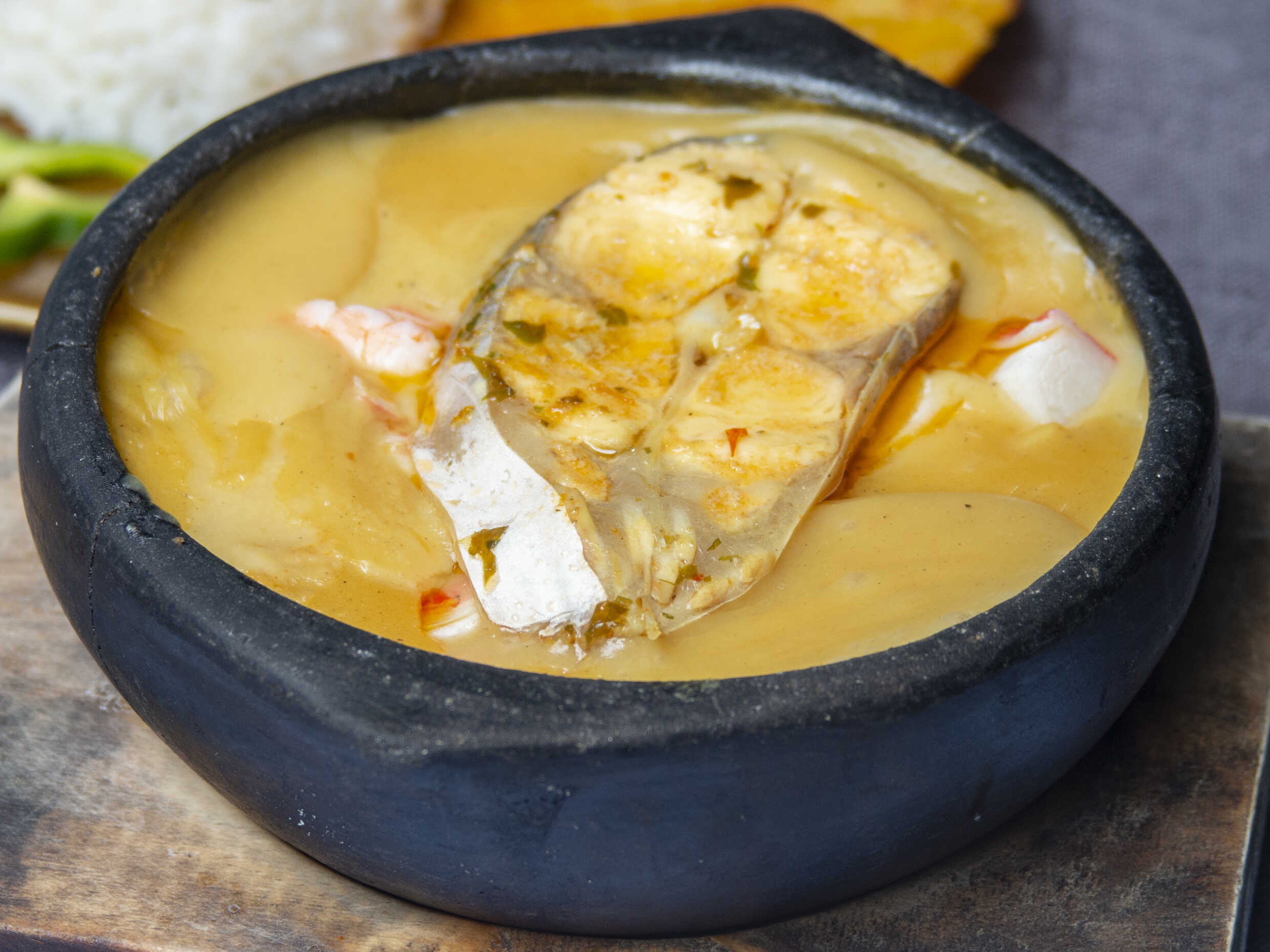 Palmito de cangrejo, pulpo, calamar, camarón y bagre. Acompañada de patacón y arroz blanco.