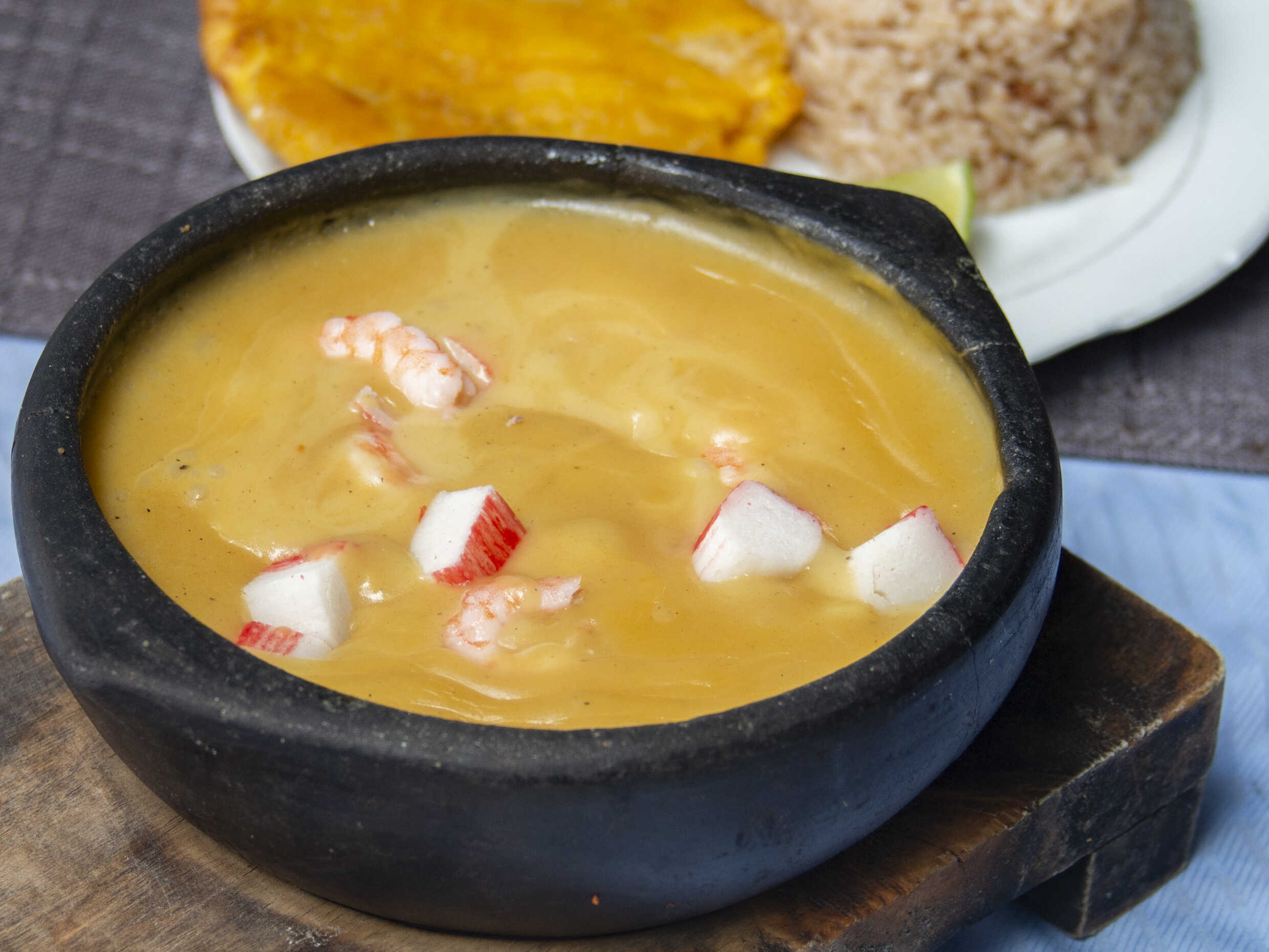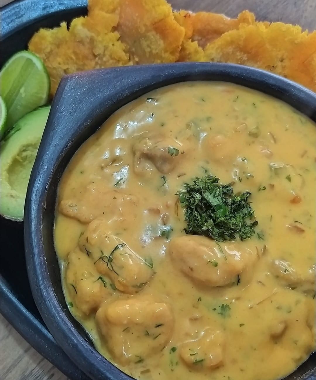 Palmito de cangrejo, pulpo, calamar, camarón, almejas, langostino y verduras. Acompañada de patacón y sopa del día.