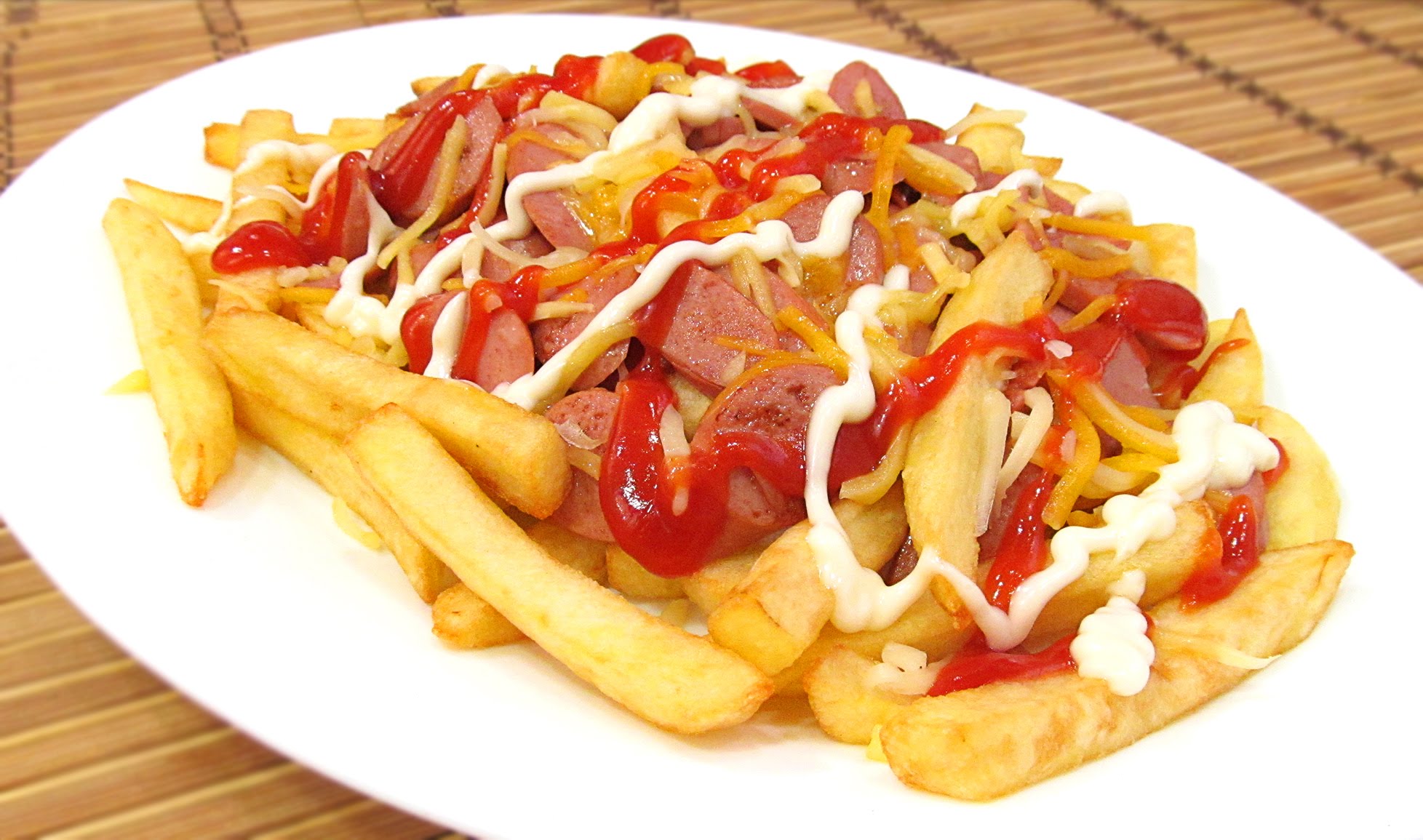 Chorizo, salchicha, pollo, carne de res, lomo de cerdo, queso rallado, tocineta con papas a la francesa, piña y tártara.