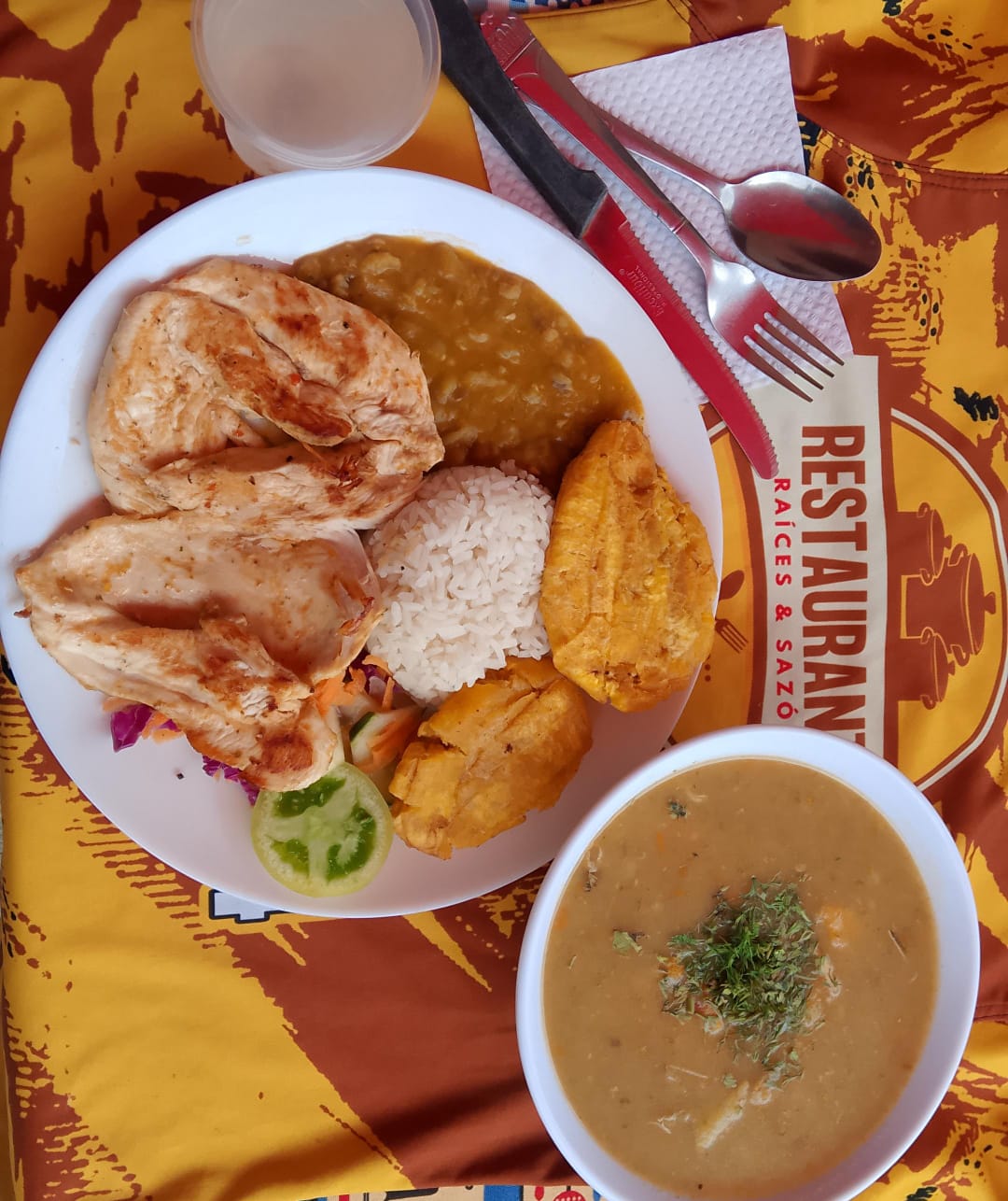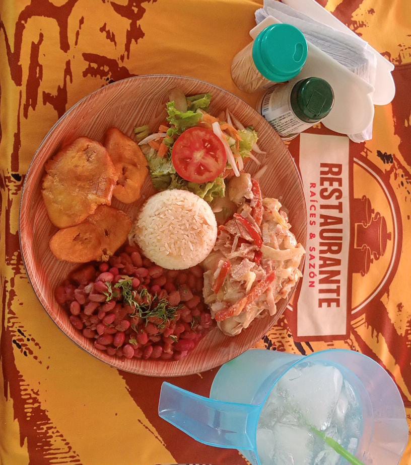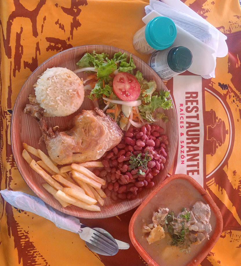 Pechuga a la plancha acompañada de arroz, sopa, principio del día, ensalada, complemento (yuca o maduro) y limonada.