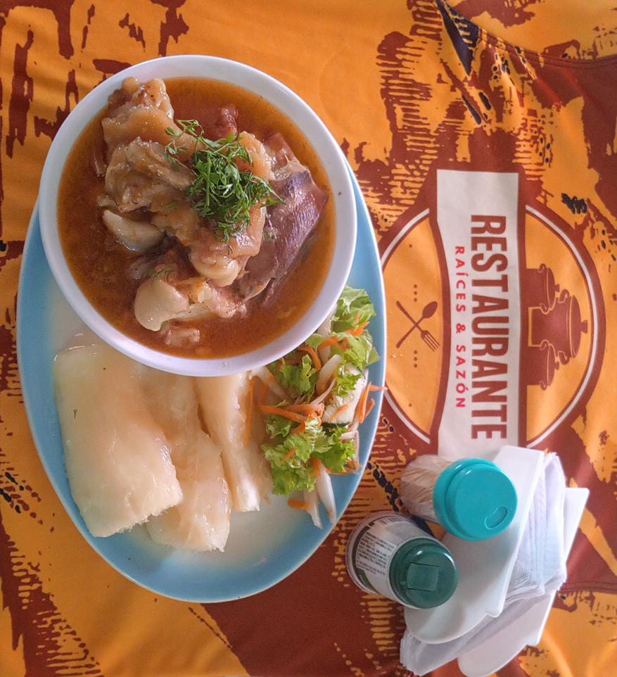 Pata de res en caldo, acompañada de yuca y ensalada.