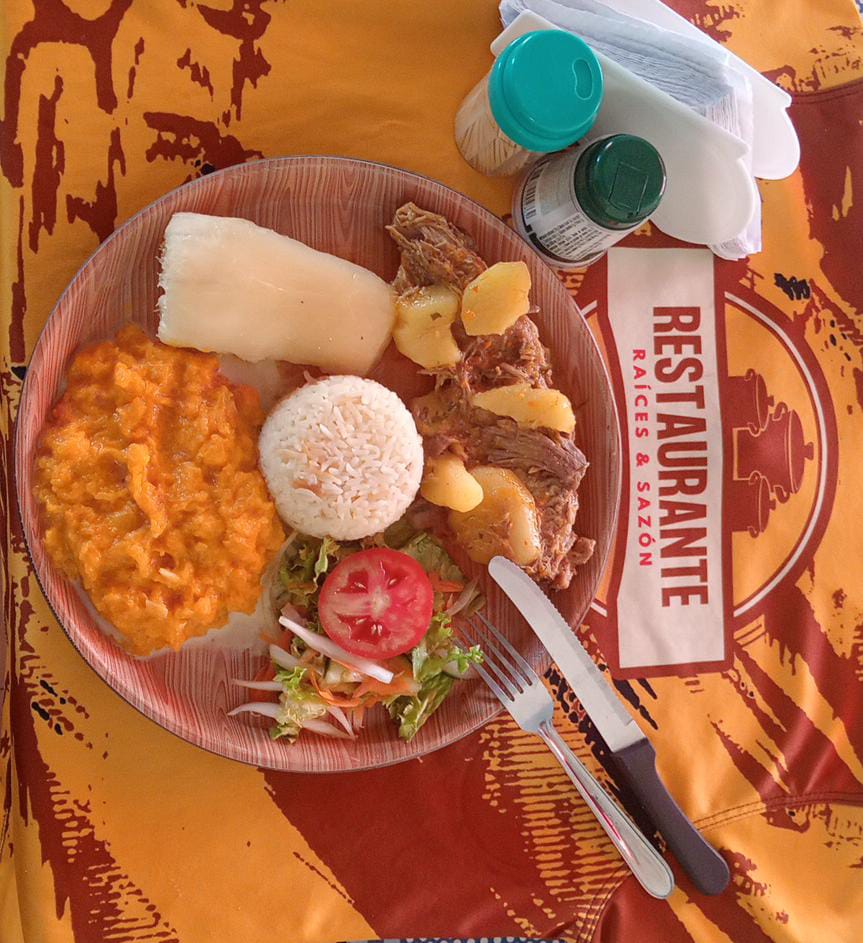 Carne sudada acompañada de arroz, sopa, principio del día, ensalada, complemento opcional y limonada.