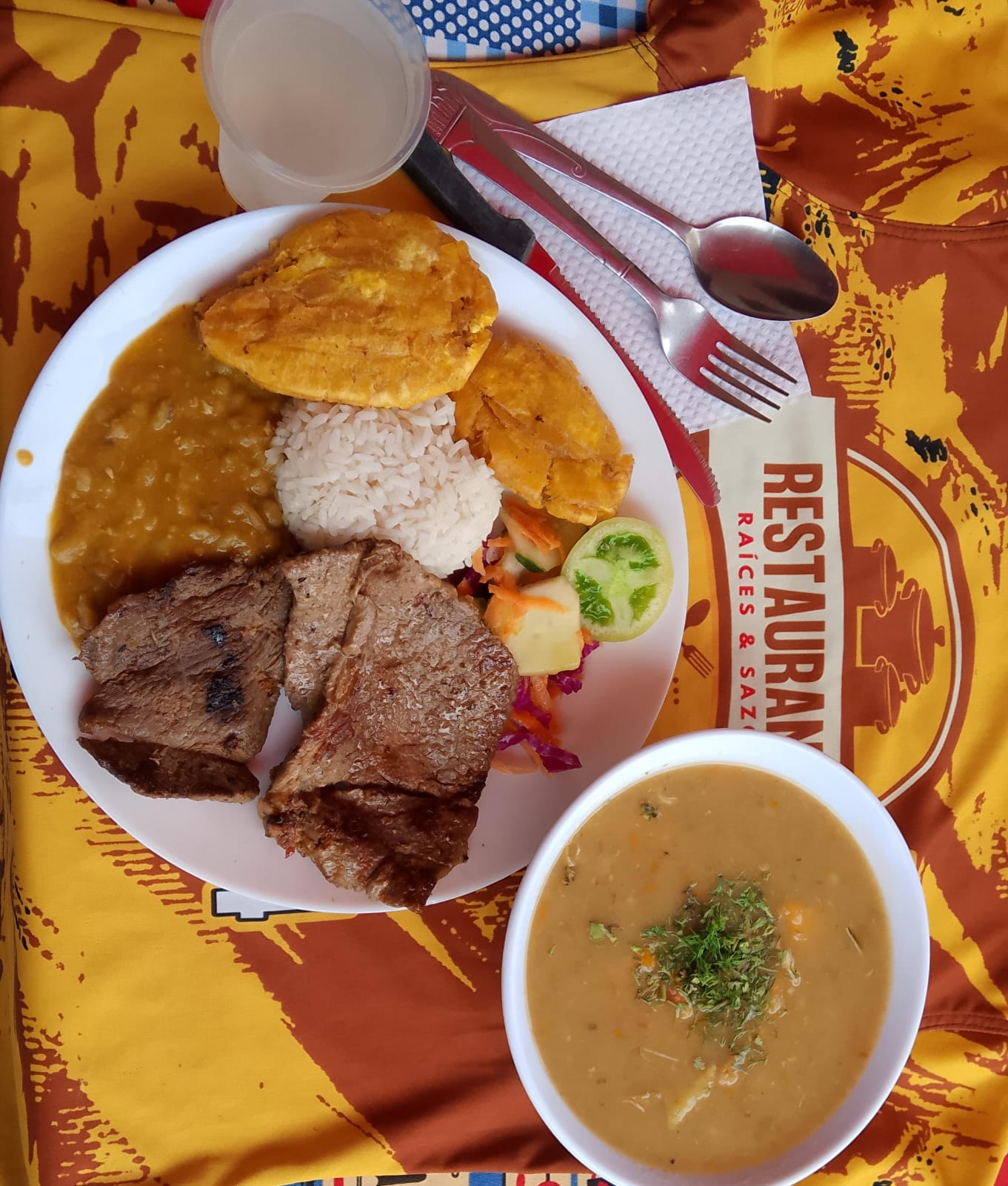 Carne asada acompañada de arroz, sopa, principio del día, ensalada, complemento opcional y limonada.