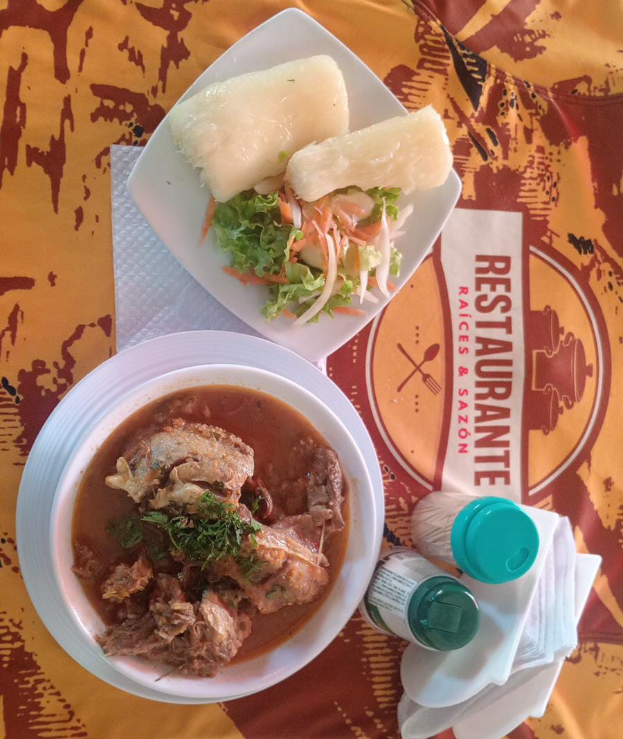 Picos de res en caldo, acompañados de yuca y ensalada.