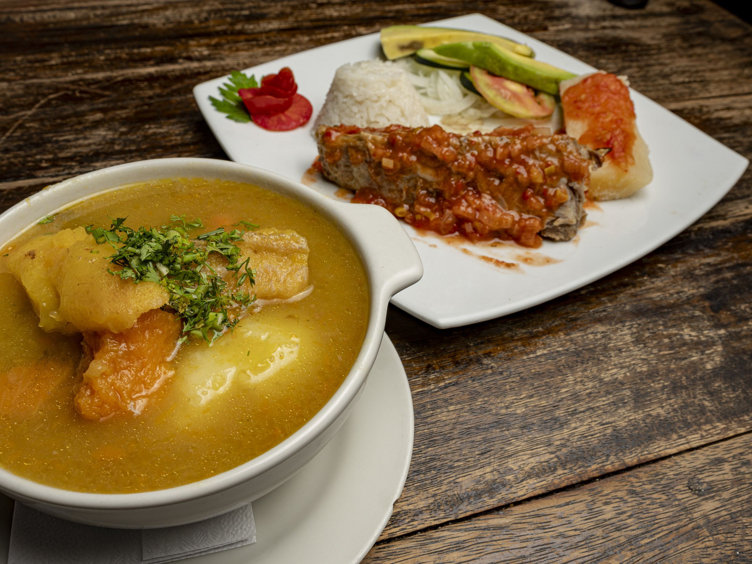 Caldo con huevo +arepa+ 180 grs carne+ yuca vapor +ensalada.